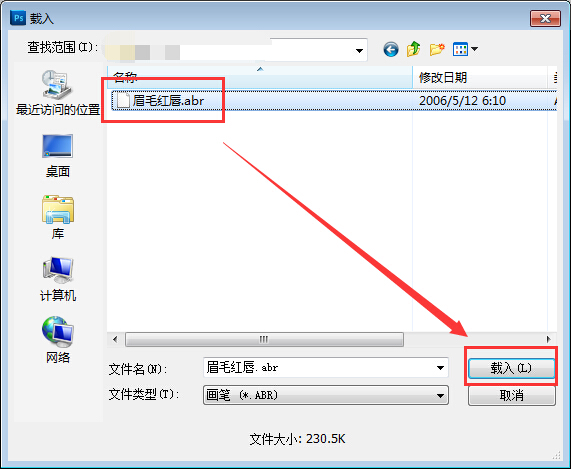 3、在載入對話框中找到筆刷后按“載入”按鈕。