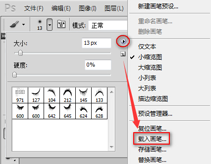 首先在左邊工具欄選擇畫筆工具,然后再點向右三角形,選擇載入畫筆,再選擇自已下載的筆刷確定即可。