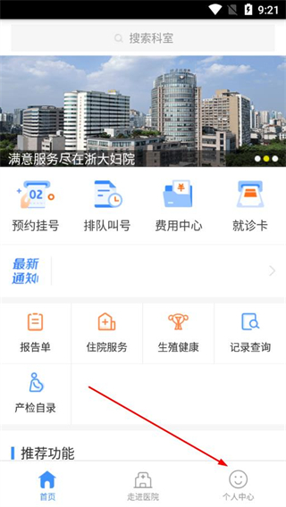 1、打開(kāi)浙大婦院app的首頁(yè),在底部導(dǎo)航欄點(diǎn)擊個(gè)人中心,進(jìn)入個(gè)人中心頁(yè)面。