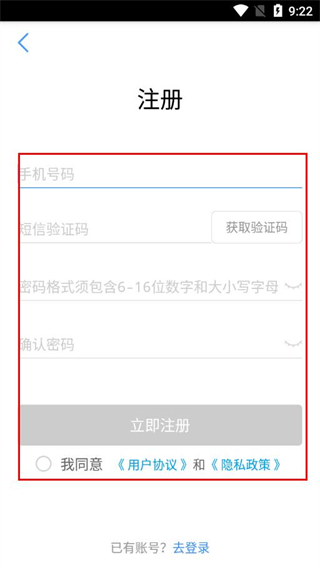 4、依次填寫(xiě)手機(jī)號(hào)碼、驗(yàn)證碼,設(shè)置密碼,再次確認(rèn)密碼后勾選同意協(xié)議,點(diǎn)擊立即注冊(cè)。