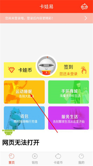 1、在卡娃易的首頁,點(diǎn)擊運(yùn)動(dòng)睡眠選項(xiàng)。