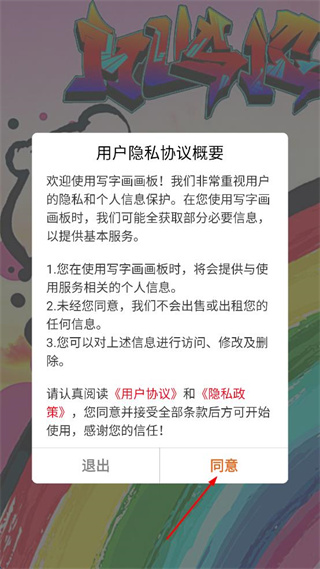 1、打開寫字畫畫板軟件,查看彈出的用戶隱私協(xié)議概要,點(diǎn)擊同意按鈕進(jìn)入繪畫界面。