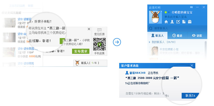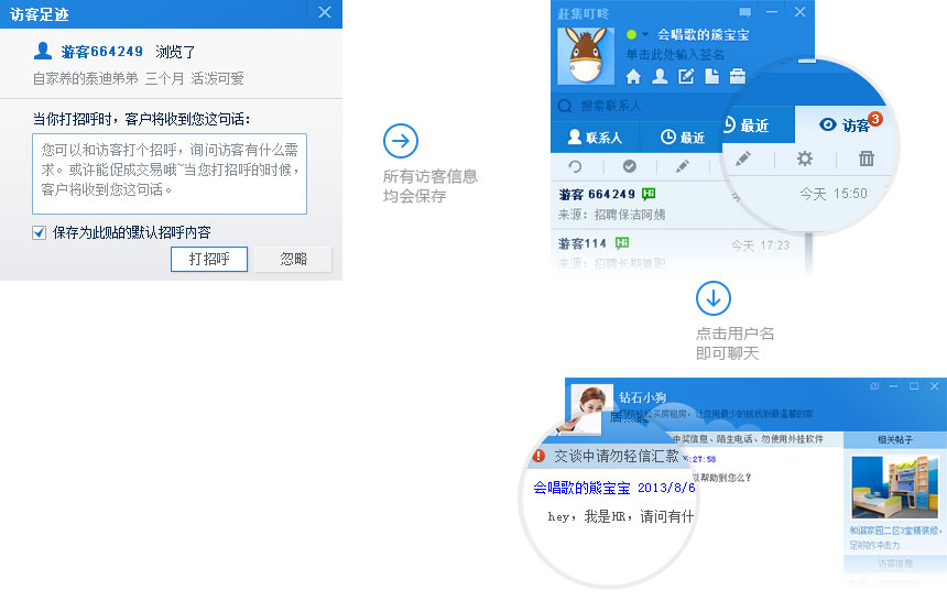 我的訪客”功能是趕集叮咚針對趕集發(fā)帖用戶量身定做的推銷功能,只要您在趕集發(fā)帖并叮咚在線,您就可以收到訪問您帖子的所有用戶 記錄的提示,即使你不在線,我們也會(huì)為您記錄訪客信息,以便您下次登錄時(shí)查詢。