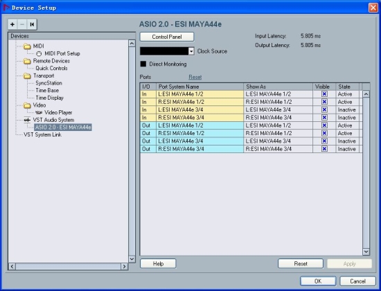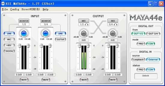在Nuendo中我們可以看到MAYA44e四進四出的模擬通道。所謂四進四出其實就是兩對立體聲輸入和兩對立體聲輸出。不過很遺憾,MAYA44e的數字口并沒有被認成為獨立的端口驅動。而是和模擬口共用的。比如在聲卡驅動的控制界面上,打開1/2輸入通道左邊的DIGITAL按鈕,1/2就成了數字輸入。輸出也是一樣??梢栽诳刂平缑娴淖钣疫厖^(qū)域中,將1/2或者3/4輸出通道設置到數字輸出。