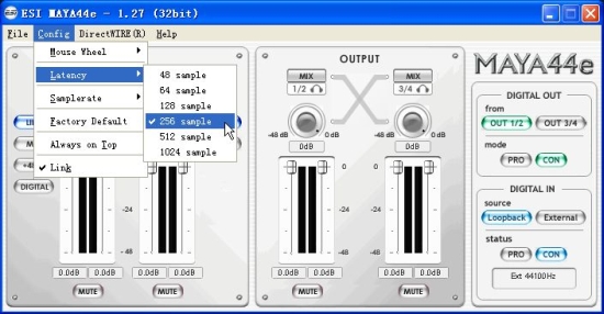 下面我們來看一下這塊卡的性能情況。在MAYA44e的控制界面中,我們可以看到它最低的延遲緩沖可以設置到48,如圖22所示。