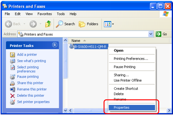 3. 右 擊 [ 用戶使用的打印機(jī) ] 圖標(biāo),并點(diǎn)擊 [ 屬 性 ] ,調(diào)出打印驅(qū)動(dòng)程序的屬性畫面“B-SX600-HS11-QM-R Properties”