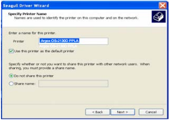 5. 輸入打印機(jī)名稱 (例如:Argox OS-2130D PPLA),接著選取「不要共享這個(gè)打印機(jī)」,然后按「下一步」