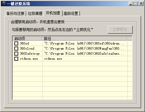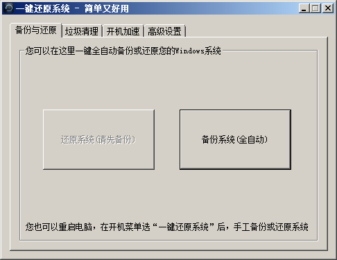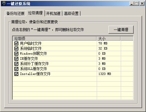 為了讓您的系統(tǒng)在備份前就達(dá)到最佳狀態(tài),“一鍵還原系統(tǒng)”還提供了“垃圾清理”和“開機(jī)加速”兩個(gè)功能,用于優(yōu)化您的系統(tǒng),如下圖