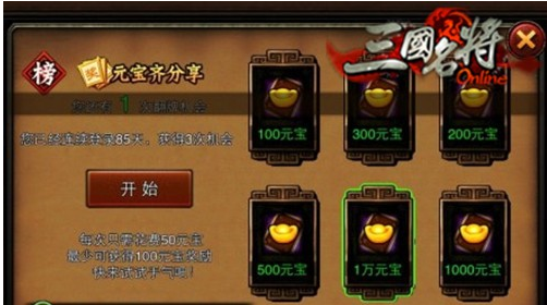免費(fèi)游戲,其實(shí)大家都明白什么是免費(fèi)游戲,完全免費(fèi)是不可能的。不過(guò)天拓游戲《三國(guó)名將》確實(shí)是一款非常適合非R玩家玩的手游,因?yàn)樵谟螒蚶镉泻芏喾椒梢阅玫矫赓M(fèi)的元寶!下面小編就給大家介紹一個(gè)最簡(jiǎn)單最無(wú)腦的方法。那就是每天登入?yún)⒓印霸獙毞窒砘顒?dòng)”,新人只要每天登入簽到就可以獲得一次免費(fèi)的翻牌抽獎(jiǎng)機(jī)會(huì)(注:隨著玩家登入次數(shù)的增多,玩家獲得的抽獎(jiǎng)機(jī)會(huì)也是隨之增多),而這個(gè)活動(dòng)里的六張牌是百分百能中元寶的,最少都有100。所有大家千萬(wàn)不要錯(cuò)過(guò),那怕沒(méi)時(shí)間玩,也可以登入下領(lǐng)取元寶。