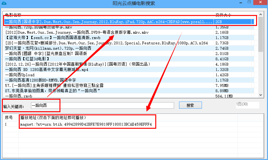 首先單擊程序右下角的“電影搜索”,在電影搜索窗口中輸入關(guān)鍵詞,點(diǎn)擊搜索,然后選擇搜出的條項(xiàng),雙擊后,窗口下方會(huì)出現(xiàn)”播放地址”,雙擊即可進(jìn)行播放。