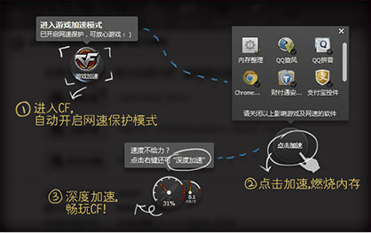 qq電腦管家cf定制版是qq電腦管家的第一個(gè)游戲?qū)0?,是QQ電腦管家為穿越火線玩家定制的專版客戶端。在電腦管家的基礎(chǔ)上,增加了CF加速和燃燒內(nèi)存等功能,還可以享受專屬皮膚功能,CF玩家不可不用。