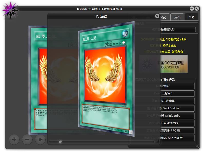 OCGSOFT游戲王卡片制作器是中國OCG工作組的又一力作。它可以讓玩家簡單、輕松的制作出自己的卡片,并用于打印。這是第三代的卡片制作器,與第二代相比,它使用了全新的3D界面引擎,并且對各種操作都做了優(yōu)化,整體體驗上比第二代好了很多。