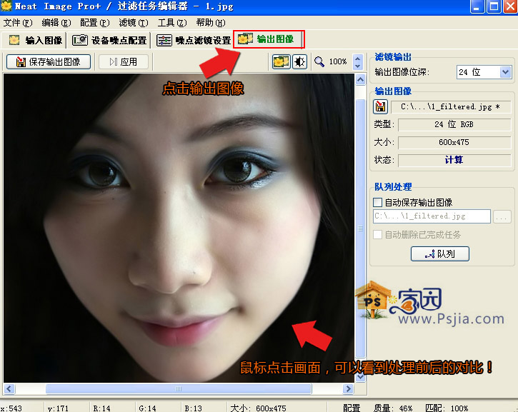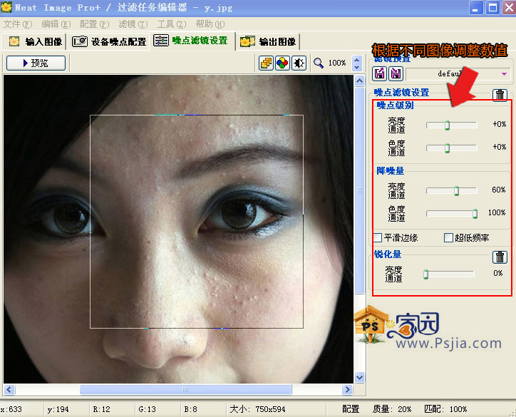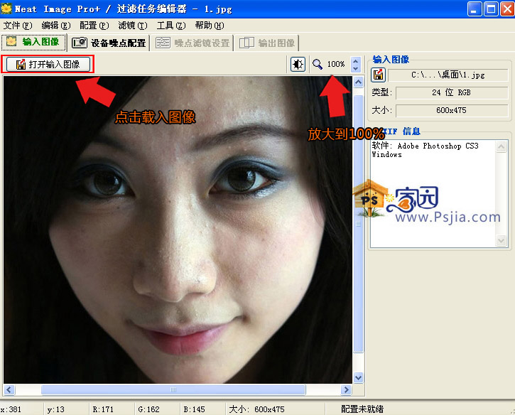 第二步,我們打開(kāi)NEAT IMAGE濾鏡,載入PS里處理好的圖片。并放大到100%,以便容易觀看效果!