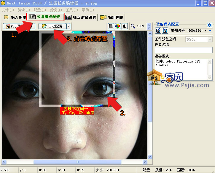 第三步,點(diǎn)擊設(shè)備噪點(diǎn)配置,然后在照片上拖選出一個(gè)框,再點(diǎn)擊自動(dòng)配置(注意:拖選時(shí)要選中皮膚,以便自動(dòng)配置)