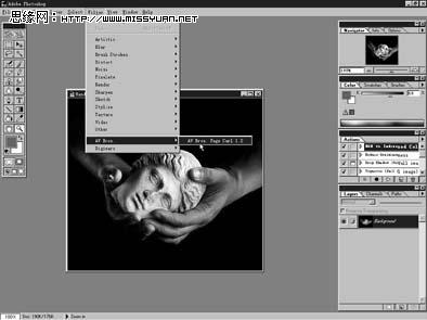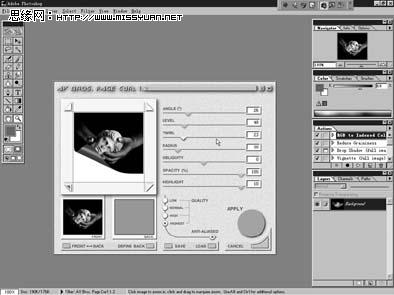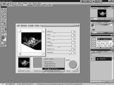 安裝完畢后,運行Photoshop,打開一幅圖像,然后你會在頂部菜單Fliter的下拉菜單中發(fā)現(xiàn)一個叫AV Bros的選項,在AV Bros中選擇page curl選項,我們就進入到page curl的工作界面了(圖1)。