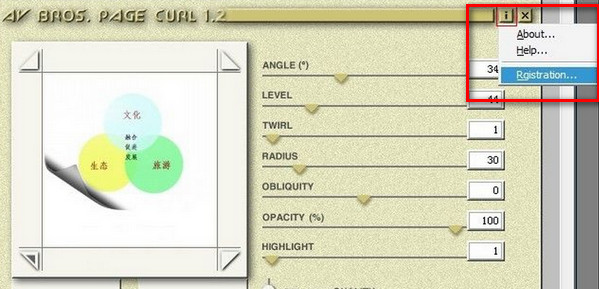 用戶下載后先運行avpagecurl12.exe等待安裝完成后,進入photoshop找到名為AV Bros該濾鏡進入,按如下圖找到注冊的地方,運行下載文件中的keygen.exe 填好后注冊就完成了