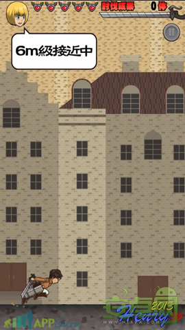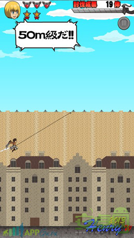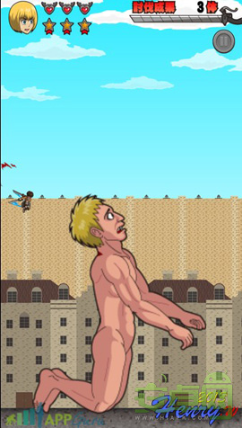 進(jìn)擊的巨人之立體機(jī)動裝置是一款由動漫改編過來的跑酷游戲。游戲中只需要點擊墻壁,就可以飛過去,途中飛過巨人脖子處時,會消滅巨人。每殺死一個巨人,得到1顆星星,收集齊5顆,則可以變身為巨人也就是無敵模式。而每被巨人拍到則減一顆紅心。這游戲首屏常年有兩行廣告,離線則變成白條。但是游戲過程中不會有廣告,喜歡進(jìn)擊的巨人的玩家可以試試哦。