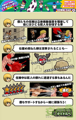由于巨人也有按照身高分為幾個等級,因此玩家在使用立體行動裝置時需要注意鋼索噴射出去的長度同角度,如果沒有準(zhǔn)確命中巨人的弱點,反而會遭受巨人的攻擊。