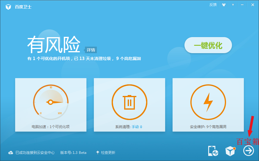 下載并安裝百度衛(wèi)士搶票專版;打開百度衛(wèi)士,點(diǎn)擊右下角箭頭→進(jìn)入【百寶箱】;