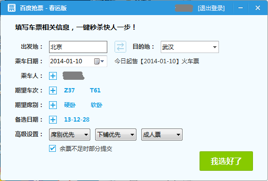 填寫出發(fā)地與目的地,乘車日期,乘車人等基本信息。(要是有期望車次、期望席別和備選日期,還能單獨(dú)挑選哦?。?/p>