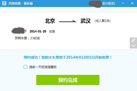 2.不在預(yù)售期:若乘車日期超出車票預(yù)售周期,則顯示“預(yù)約完成”。在車票預(yù)售前,用戶將會收到短信和彈窗提醒,告知用戶搶票,用戶之后進(jìn)入“一鍵秒殺”環(huán)節(jié),開始搶票,然后最終搶票成功,支付訂單。