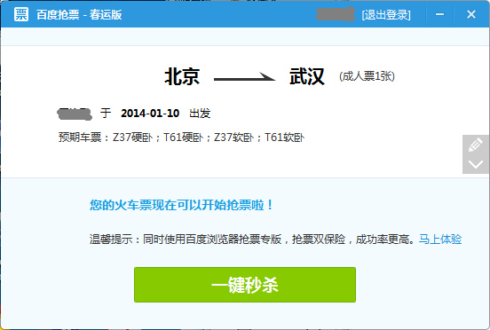 百度衛(wèi)士搶票專版,全程無碼,一鍵秒殺,搶票快人一步!