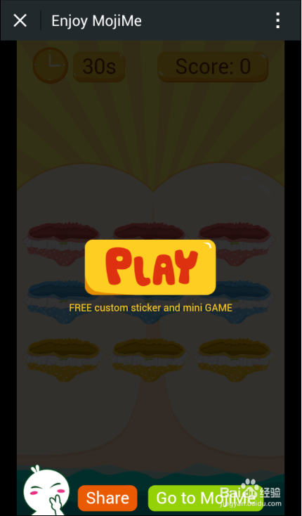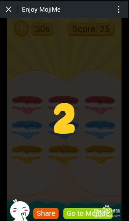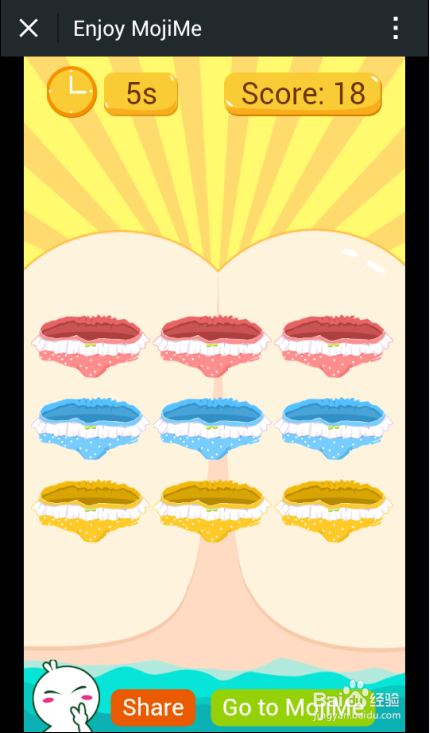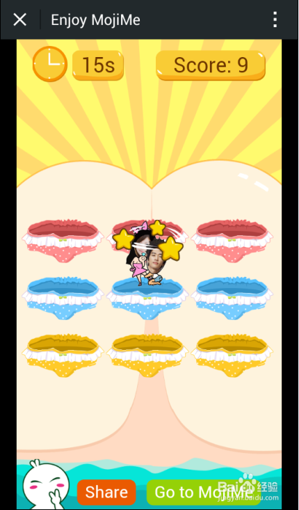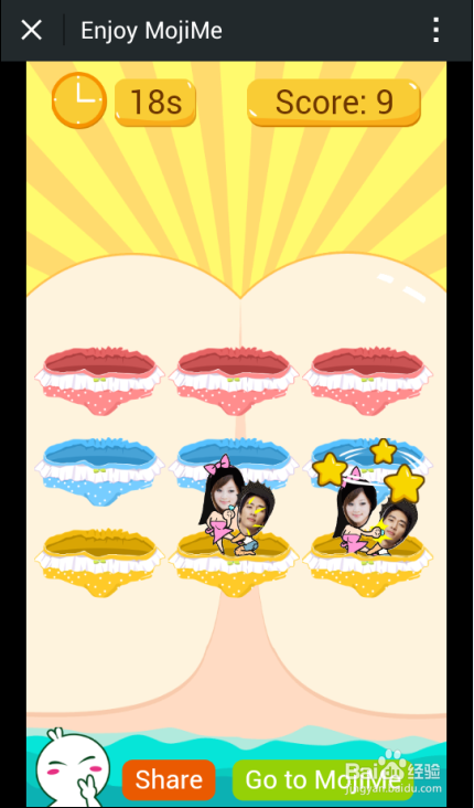 7、MojiMe 游戲界面上一共有九個(gè)洞洞、你制作的頭像表情會(huì)隨機(jī)從某一個(gè)洞洞跳出來(lái)。