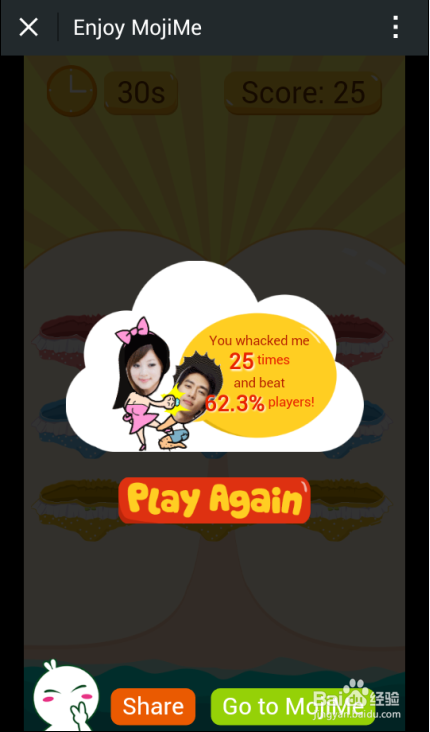 有了MojiMe,不但能與WeChat好友分享專(zhuān)屬動(dòng)態(tài)貼圖,還可以在WeChat朋友圈及Facebook上與好友挑戰(zhàn)“打地鼠”游戲?。?/p>