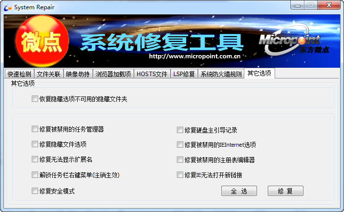 微點(diǎn)系統(tǒng)修復(fù)工具是一款綠色免費(fèi)的系統(tǒng)修復(fù)軟件,該軟件功能強(qiáng)大,簡(jiǎn)單易用,占用內(nèi)存小,能修復(fù)一些系統(tǒng)常見(jiàn)問(wèn)題,包括文件關(guān)聯(lián)、修改host文件、修復(fù)ie不能打開(kāi)等問(wèn)題,喜歡的用戶就下載吧。