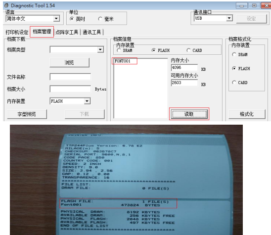 “檔案信息”,選擇“內存裝置”為FALSH,點擊“讀取”,可以查詢字體“FONT001”