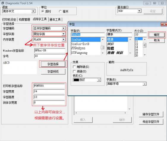 • “字型選擇”選擇欲打印字型,如此處選擇Windows字SimSum。
