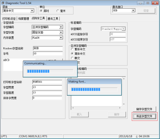 設置完畢后,點擊如圖紅色標記處“傳送字型文件”,將字體下載至打印機Flash中。