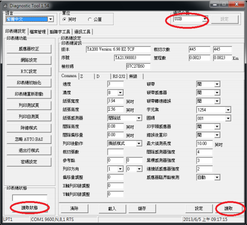說明 : 由于打印機的 LPT 為單向裝置,故不能用于回傳打印機狀態(tài), 當選擇 LPT 為傳輸界面時,“讀取狀態(tài)” 將無法執(zhí)行