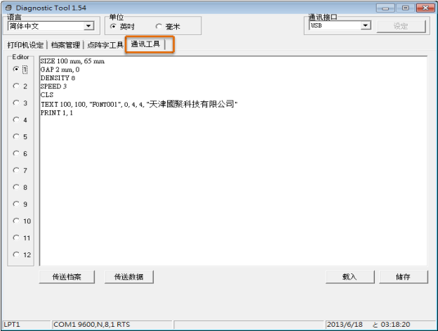 • 點擊“傳送數據”,將會將中間空白區(qū)域的編輯區(qū)的TSPL命令傳送至打印機立即執(zhí)行。編輯區(qū)提供12個編輯板塊,便于不同程序命令編輯。