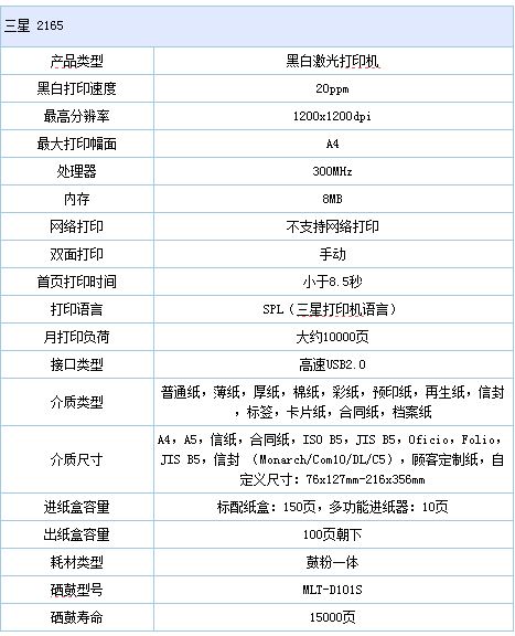 三星2165黑白激光打印機(jī)首頁打印時(shí)間小于8.5秒,支持SPL打印語言,20ppm的黑白打印速度,最高分辨率達(dá)到1200*1200dpi,可進(jìn)行手動(dòng)雙面打印操作,月打印負(fù)荷大約10000頁;耗材方面,采用鼓粉一體式設(shè)計(jì),使用MLT-D101S硒鼓類型,硒鼓壽命可達(dá)到1500頁,既經(jīng)濟(jì)又耐用。