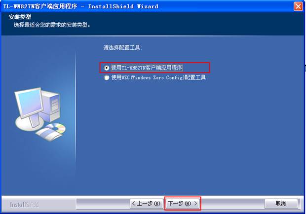 選擇安裝網(wǎng)卡配置工具。如果您希望通過(guò)TP-LINK配置工具進(jìn)行配置,請(qǐng)選擇第一項(xiàng),如果您希望通過(guò)Windows自帶的配置工具進(jìn)行配置,請(qǐng)選擇第二項(xiàng)。這里選擇第一項(xiàng),點(diǎn)擊下一步繼續(xù)。