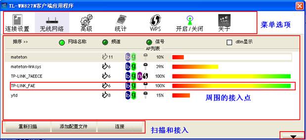界面上面部分是菜單選項(xiàng),中間部分是掃描到的周?chē)慕尤朦c(diǎn),下面部分是連接設(shè)置和連接到接入點(diǎn)。雙擊掃描到的接入點(diǎn),可以查看接入點(diǎn)的詳細(xì)信息。