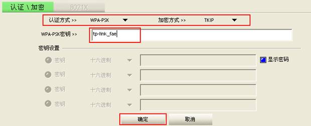 它的認(rèn)證方式是:WPA-PSK;加密方式是:TKIP;密鑰是:tp-link_fae。則TL-WN827N客戶端的認(rèn)證\加密要和接入點(diǎn)一樣設(shè)置,如下圖。