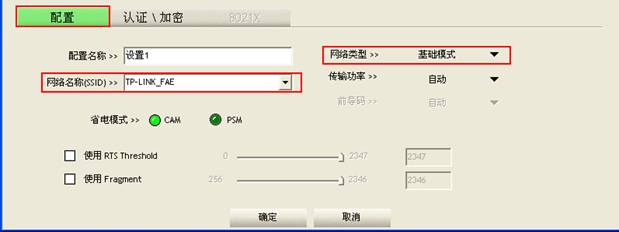 在配置中選擇網(wǎng)絡(luò)類型為基礎(chǔ)模式,網(wǎng)絡(luò)名稱(SSID)填寫(xiě)接入點(diǎn)的SSID,其它設(shè)置保持默認(rèn)狀態(tài)。