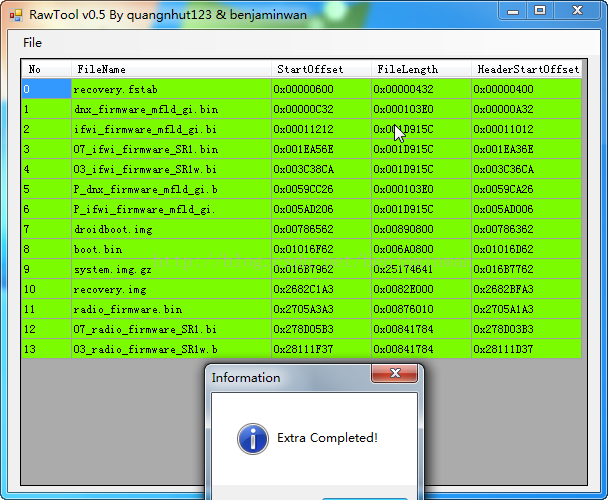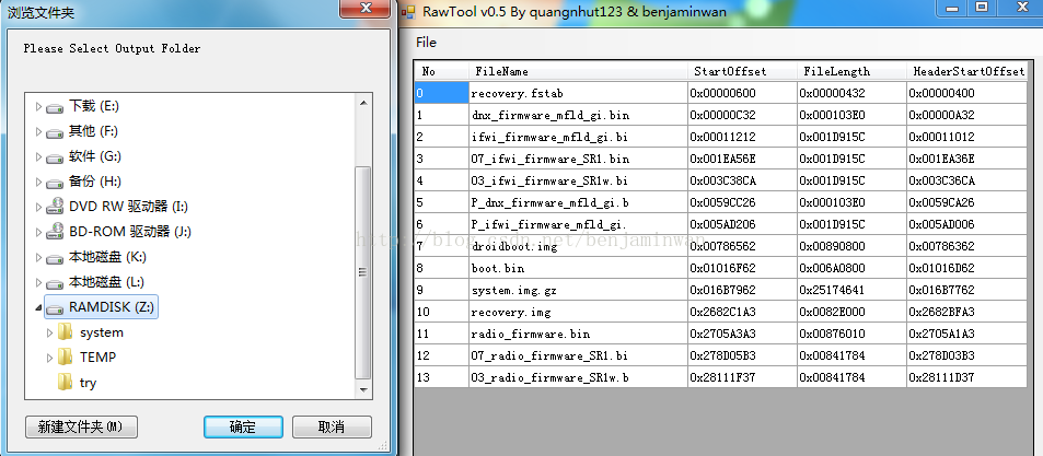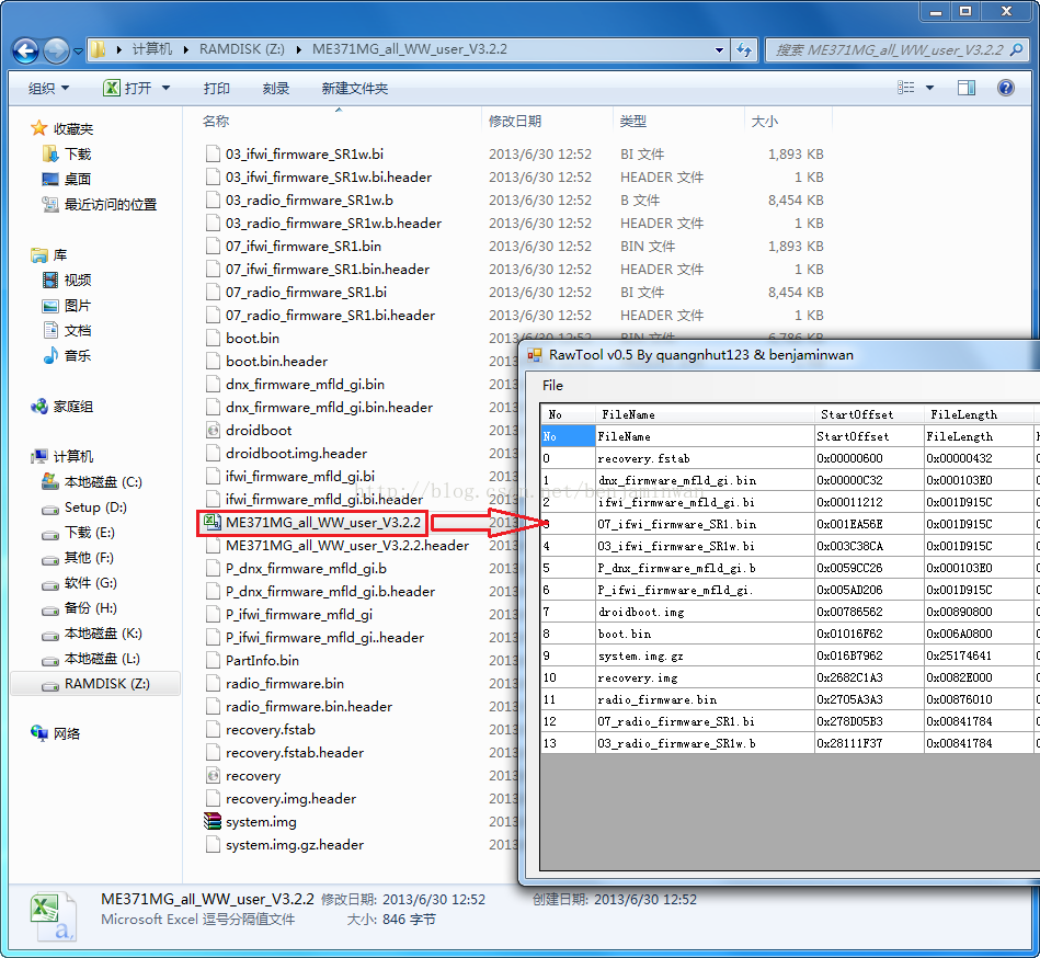 5.解壓后的文件夾里,有個(gè)與ROM文件名相同的csv文件,此文件記錄了raw解壓信息,用鼠標(biāo)左鍵拖拽到rawtool窗口,可以再將解壓后的文件再次組合成raw文件。