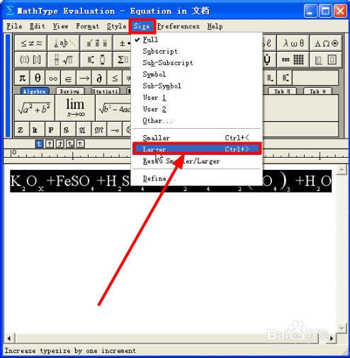 怎么改呢,在word里雙擊公式,彈出公式編輯器,選擇公式,點(diǎn)擊“size”,彈出下拉菜單,選擇“l(fā)arger”,多次調(diào)解,如圖所示