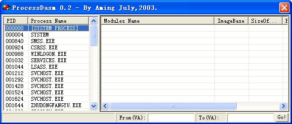 在列表中選左邊的進(jìn)程欄,當(dāng)右邊出現(xiàn)模塊欄時(shí),雙擊你要查看的模塊可以得到Pe信息,可以同時(shí)查看多個(gè)。要反匯編的話,在狀態(tài)欄有卻省的合法地址,你可以定制你的地址,然后按“GO!”就進(jìn)行反匯編了。也可以同時(shí)反匯編多個(gè)文件。