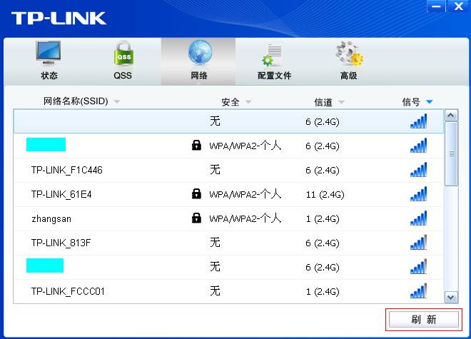 安裝完成后,自動(dòng)彈出客戶端界面,在 網(wǎng)絡(luò) 點(diǎn)擊 刷新 可以搜索周圍的無線信號(hào)。