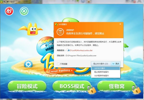 第二點:安裝了殺毒軟件的朋友們請關(guān)閉殺軟或者加載一下白名單,方可正常使用保衛(wèi)蘿卜猴子輔助??!
