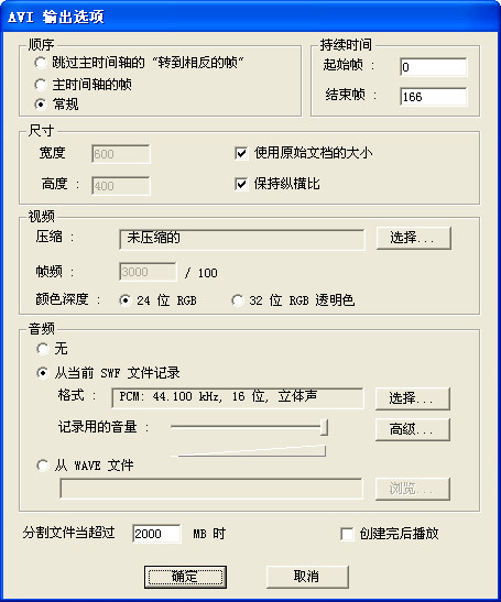 音頻:如選用Flash動畫本身的聲音,則需將“記錄用音量”調(diào)高,以保證轉(zhuǎn)換后的音量,也可選擇音頻的品質(zhì),如“44100HZ,16位,立體聲”、“11025HZ,8位,立體聲”等。