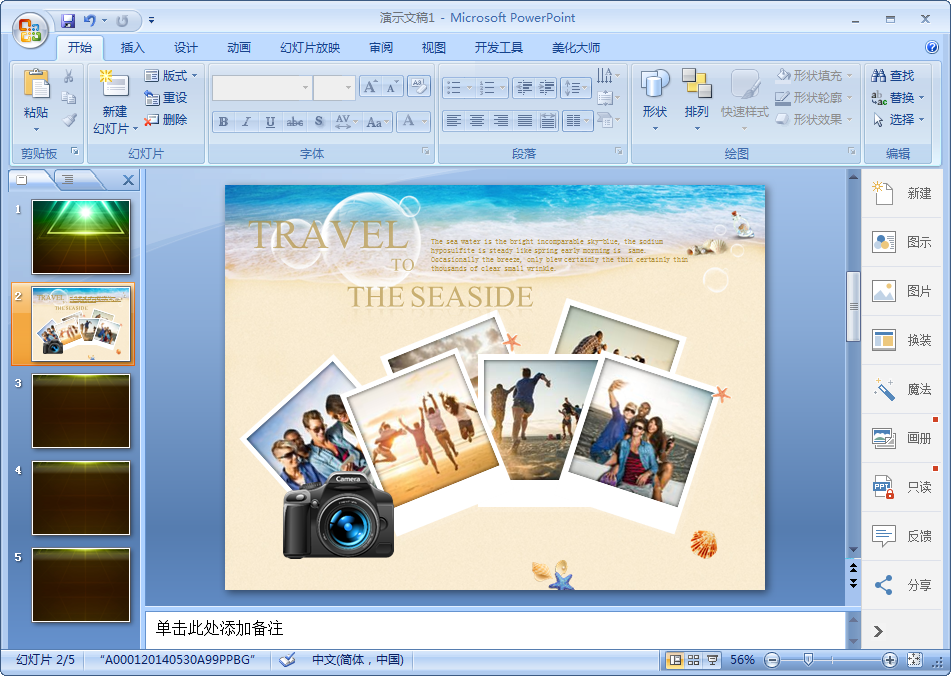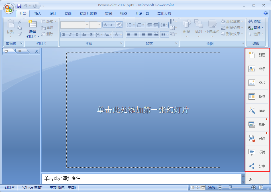 2、打開一個PPT文檔,可以在右邊看到文檔美化大師的菜單