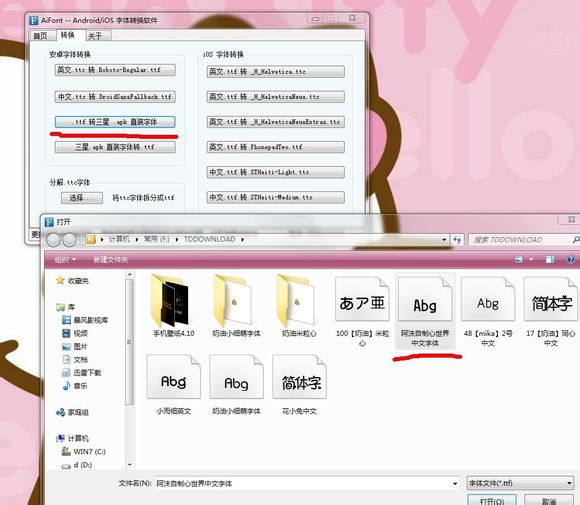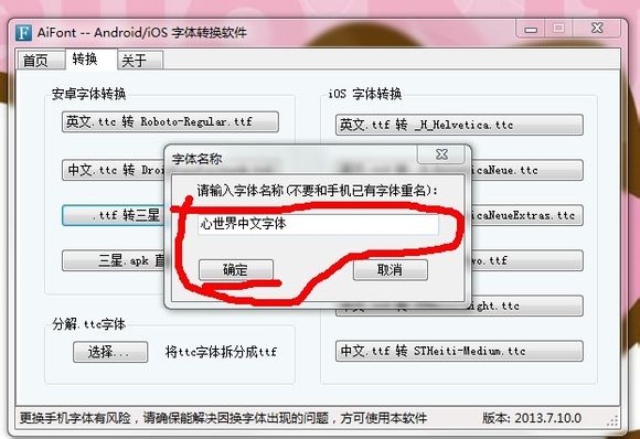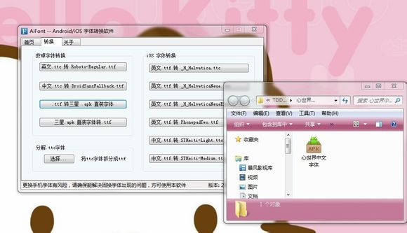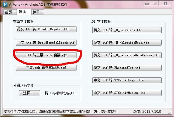AiFont可以將電腦/安卓系統(tǒng)用的ttf/三星apk/小米mtz字體轉(zhuǎn)換為iPhone/iPad/iTouch用的ttc字體,也可以將iPhone/iPad/iTouch用的ttc字體轉(zhuǎn)換為電腦/安卓系統(tǒng)用的ttf/三星apk/小米mtz字體,還可以將iOS 6和iOS 7字體互轉(zhuǎn)