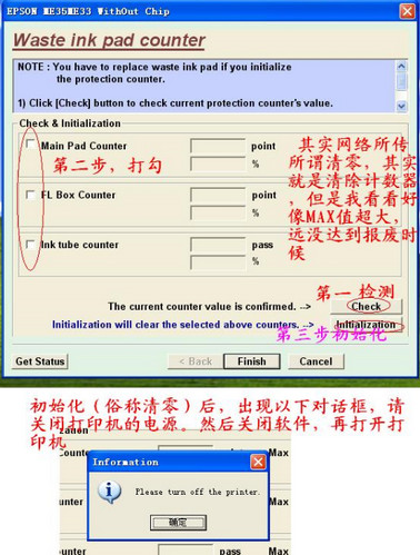 4、到了這一步,直接點擊check檢查一下打印機計數(shù)器,然后將標(biāo)記的這三個選項打勾,再選擇check下面的初始化按鈕,就是那個比較長的英文按鈕