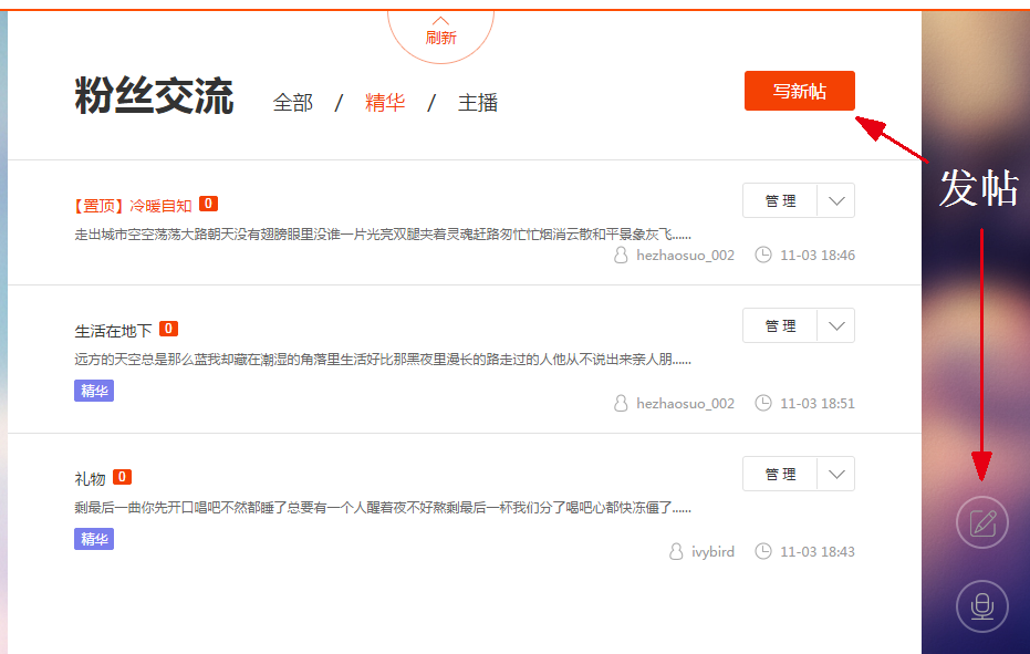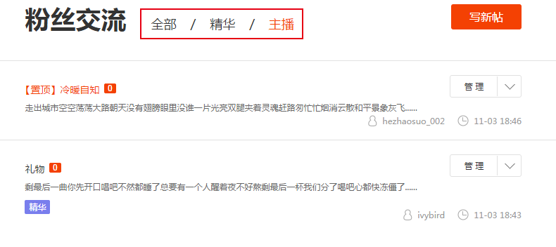 針對(duì)主播個(gè)人頁(yè)的帖子主播和社區(qū)管理員具有如下權(quán)限(鼠標(biāo)懸浮于帖子右邊【管理】按鈕即可浮出):