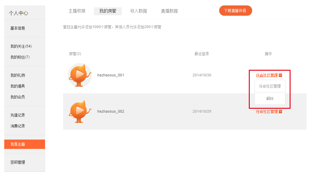 主播在“我是主播/我的房管”頁(yè)面中,可以將直播間房管任命為社區(qū)管理員,也可以將社區(qū)管理員撤銷。